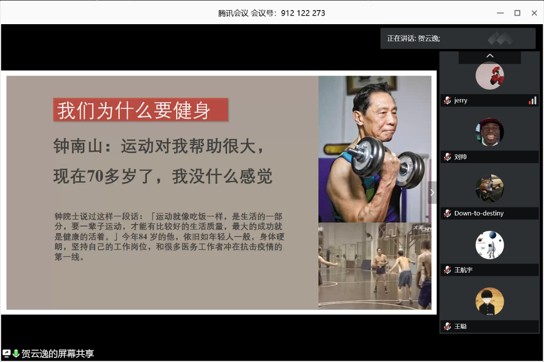 贺云逸同学鼓励大家居家健身,提高身体素质、增强体魄。向大家推荐了一些在家进行徒手、哑铃健身时能用到的卷腹、推举、划船等动作,并且强调居家健身时需要注意练前练后的热身、拉伸以及锻炼过程中的人身以及财产的安全问题。