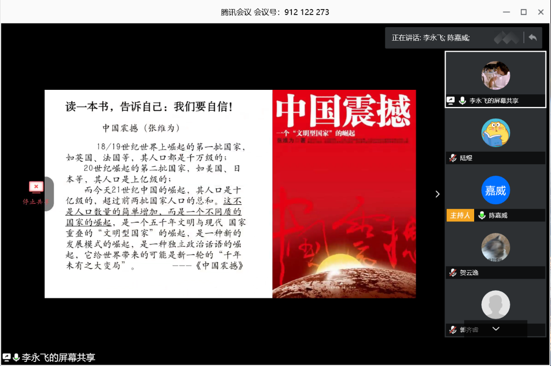 李永飞同学建议可以借助难得的假期阅读书籍,以陶冶情操、开拓思维,他向大家推荐了张维为教授所著的《中国震撼》,以帮助同学们更客观地认识中国崛起的事实,理解中国崛起背后的文化内涵;分享了浙江大学党委副书记郑强同志所做的一些报告,希望借此引发同学们对于青年一代使命担当的思考;还为大家推荐了一首催人奋进的歌曲《你要跳舞吗》,以此勉励同学们在家也要保持高昂的学习热情和积极的生活态度。