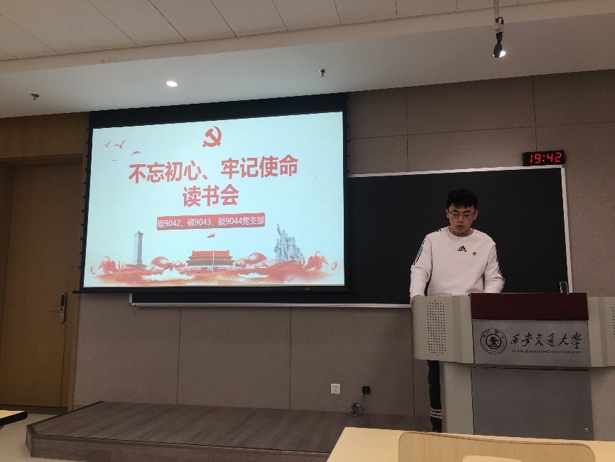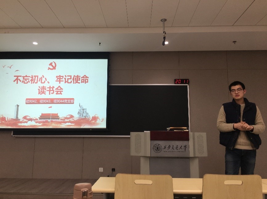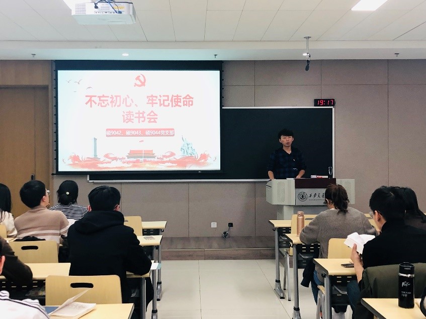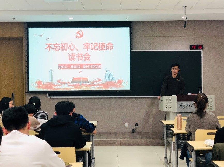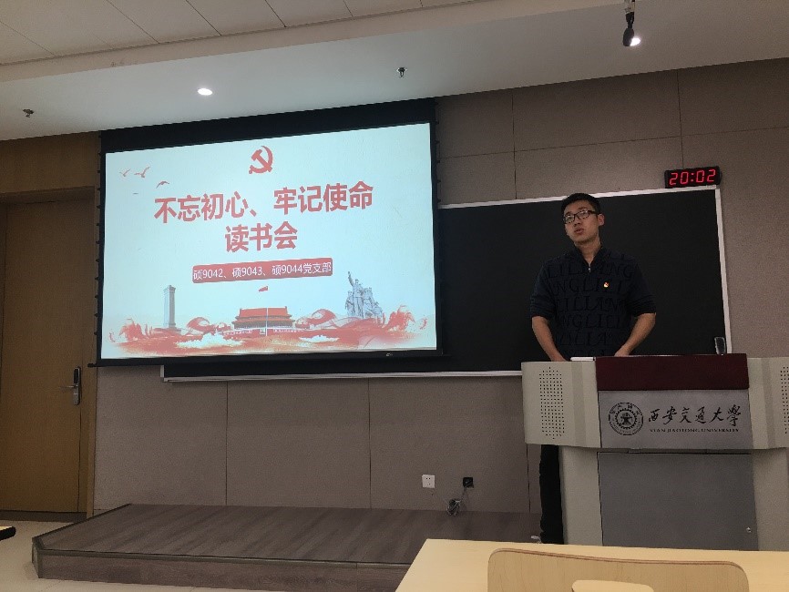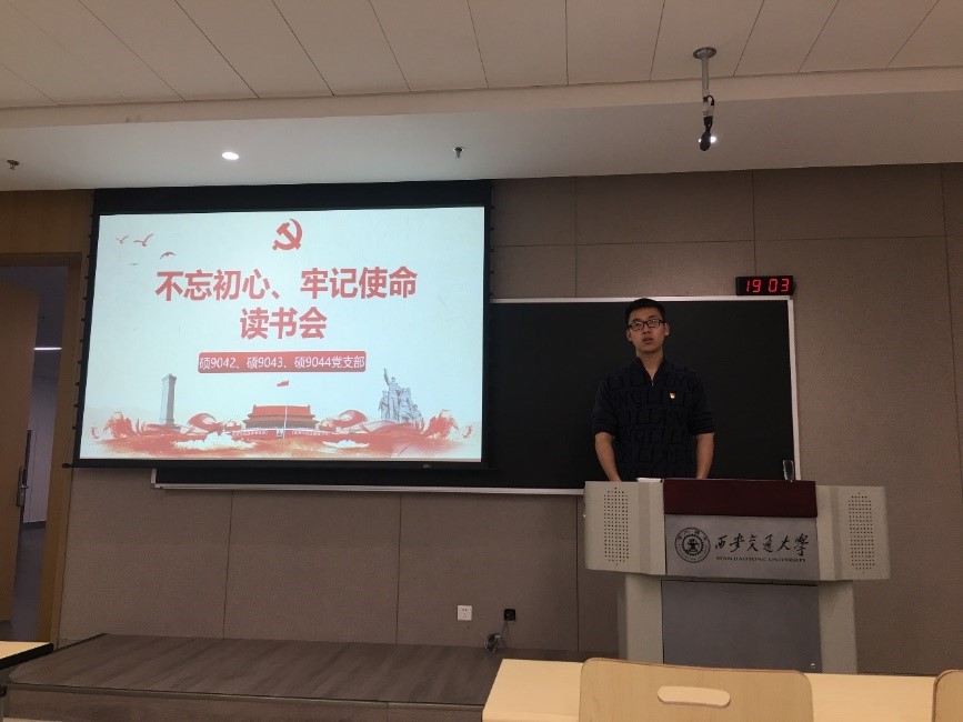 硕9042、9043和9044班党支部在创新港联合开展 “不忘初心,牢记使命”读书会活动。各支部党员分享《习近平关于“不忘初心,牢记使命“论述摘编》相应章节的学习心得与体会。该活动由9044党支部书记谷宇豪同志主持。