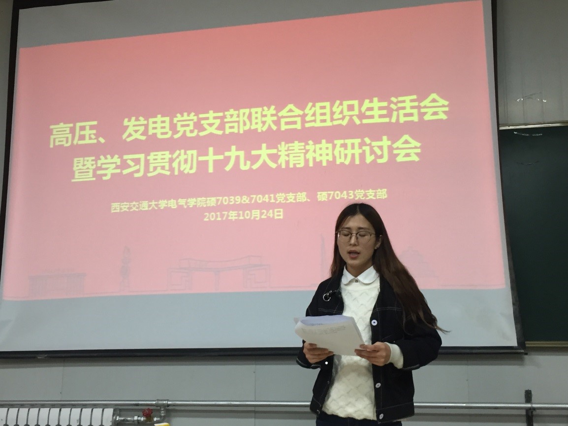 2017年10月24日晚,硕7039/41班党支部和7043班党支部在高电压技术教研室联合举行了主题为“学习贯彻十九大精神”的组织生活会。