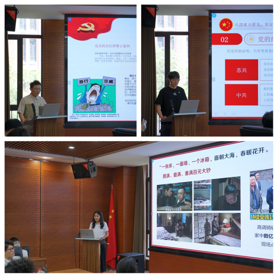 三个党支部的党员同志分别从不同角度围绕党纪学习教育开展学习交流。硕3065党支部的郭起聪详细解读了“六大纪律”,尤其是廉洁纪律,通过“不敢腐、不能腐、不想腐”一体推进的历史演变,鼓励党员们要实现自律向自觉的转变,进而坚守正道,推动全面从严治党不断深化。硕3070党支部的庄毅着重强调了党员干部的党性教育和党纪遵守,通过案例警示党员干部要时刻自我约束,坚决维护党的整体形象和严明的纪律性,走好网上群众路线。绝缘博士第一党支部的徐浩从违纪典型案例入手剖析条例,强调党员必须严守党纪,坚持廉洁,以身作则,引导身边同志从案例中汲取教训,不断提升党性修养和工作水平。