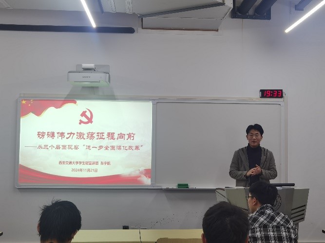 学生微宣讲团成员张宇航为支部同志进行主题宣讲。张宇航从三个层面对党“进一步全面深化改革”的指示进行观察剖析,并结合高校科研工作者的实际,论述了推进科教领域全面深化改革的重要意义和深远影响,并指出党的改革举措直面问题,敢于通过改革加快教育强国、科技强国、人才强国建设,并形成多项改革综合提升的澎湃动能。
