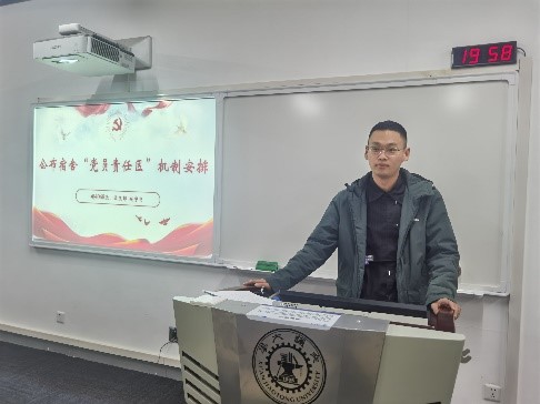 硕4068党支部组织委员赵宇飞同志介绍了建设宿舍“党员责任区”的机制安排,并宣读了党支部所选出的党员责任人名单”党员责任区“的建设旨在发挥党员同志的先锋模范作用,通过在每个宿舍任命党员责任人的方式落实党员责任,引领宿舍内的同学共同建设团结互助、积极向上、乐观友爱的宿舍环境。