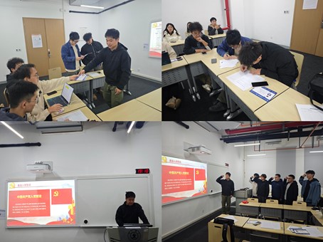 紧接着,党支部书记书带领全体党员重温入党誓词,并通过分享视频,与同学们一同学习了入党誓词的变迁历程。在中国共产党百年奋斗历程中,入党誓词几经变迁,已经很难确切统计,入党誓词究竟存在过多少种版本,但不管时代如何变迁,有一条誓词——“永不叛党”却从未改变。通过重温入党誓词,党员们更加深刻地铭记自己的初心和使命。
