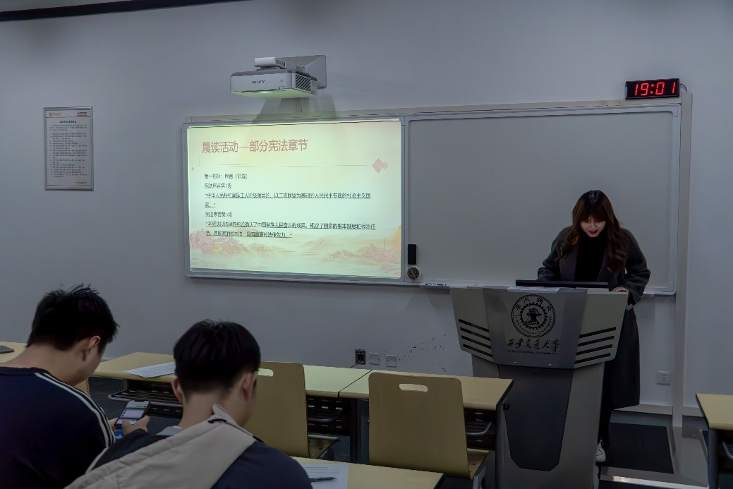 活动在庄严的宪法晨读中拉开帷幕。活动开始,由许馨愉同学带领大家齐声诵读了宪法序言的部分内容,宪法序言中明确指出:“中华人民共和国是工人阶级领导的、以工农联盟为基础的人民民主专政的社会主义国家。”这一句话道出了我国的国家性质,彰显了人民的主体地位。宪法序言确认了中国人民奋斗的成果,规定了国家的根本制度和根本任务,是国家的根本法,具有最高的法律效力。我们深知,宪法不仅是国家的基石,更是我们每个人的行为准则。