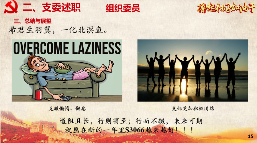 会议第二项由硕3066党支部各支部委员进行2024年度述职,在述职环节,支部书记孟雨晨、副书记王辉、组织委员李翔、纪检兼宣传委员穆亚茹依次进行了年度述职汇报。他们从个人学习情况、工作成效及存在不足等方面进行了全面总结,并提出了切实可行的改进方案和新年度工作规划。同时进行了批评与自我批评,通过总结与反思,进一步明确了支部工作的发展思路。