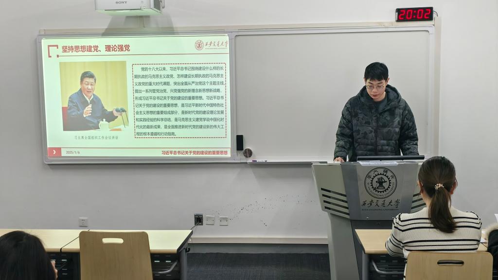 首先,唐嘉玙带领同学们学习了习近平总书记关于党的建设的重要思想,着重探讨了“坚持思想建党、理论强党”的核心理念,回溯了古田会议决议中的建党原则,彰显了从思想层面建党的独特道路与马克思主义政党的先进本质。他强调,应将思想建党与制度治党紧密结合,以习近平新时代中国特色社会主义思想为指引,凝聚共识,武装全党,激励同学们积极汲取马克思主义中国化时代化的最新理论精髓,为全党全国各族人民的团结奋斗奠定坚实的思想基石。
