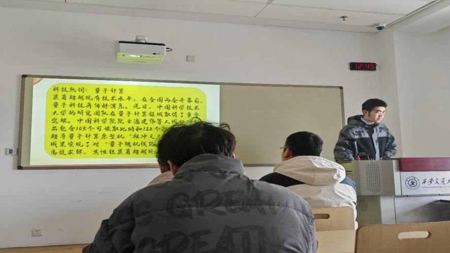 活动第一项由党支部书记吴博同志带领支部成员深入学习了国务院总理李强作的2025年政府工作报告中强调的内容,充分认识中国式现代化“稳”的态势、“进”的步伐,同时普及全国两会科技热词,引导支部成员关注本专业密切相关的全国两会热点问题,详尽介绍“量子计算”和“具身智能”两大科技热词。