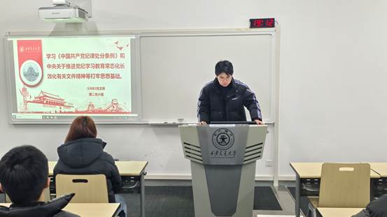 李震宇带领支部成员系统学习了《中国共产党纪律处分条例》相关内容,并强调推进党纪学习教育常态化长效化的重要性。他指出,党纪教育是维护党的团结统一的“生命线”,也是新征程上凝聚奋斗力量的“动力源”。作为青年学生党员,学习党纪不仅是锤炼政治品格的必修课,更是扣好人生“第一粒扣子”的关键举措。党的纪律不仅仅是一纸规定,更需要在日常实践中时刻保持警觉并不断加强学习。通过深入研读《条例》,支部成员进一步明确了政治纪律、组织纪律、廉洁纪律等“六项纪律”的核心要求,为今后的学习和工作提供了行为准则。
