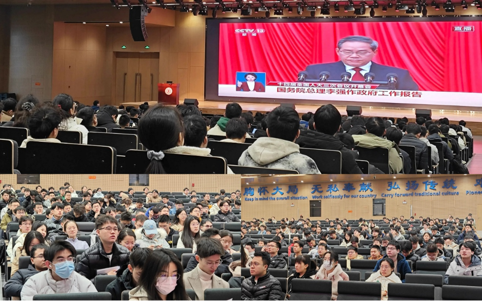 3月5日上午9点,休闲小栈 在涵英楼5-2E201千人报告厅组织开展“聆听两会声音,践行青年担当”主题教育活动,300余名硕博研究生集中观看第十四届全国人大三次会议开幕会直播,同步学习政府工作报告,沉浸式感悟国家发展脉动。