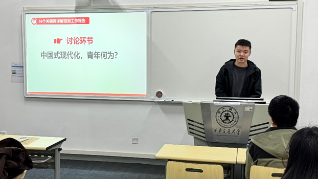 张启恒同学以“详解政府工作报告,领会两会精神”为主题,通过36个关键词详细解析了2025年政府工作报告的主要内容。她重点解析了与青年成长、国家发展紧密相关的政策导向和重点任务,如科技创新、教育发展、医疗卫生改革等。她帮助同学们全面、深入地理解了政府工作报告的核心内容和两会精神,增强了大家的政治觉悟和使命担当。