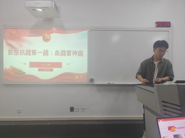 于京辉结合实地调研经历,带来“胶东抗战第一战:血战雷神庙”的红色记忆分享。通过展示战斗遗址弹痕墙、理琪烈士遗物等珍贵史料,还原1938年山东抗日救国军第三军打响“胶东抗战第一枪”的壮烈场景。通过讲解向同学们说明这场以弱胜强的突围战,不仅创造了毙伤日军50余人的战绩,更用热血铸就了“忠诚担当、敢为人先”的胶东精神。