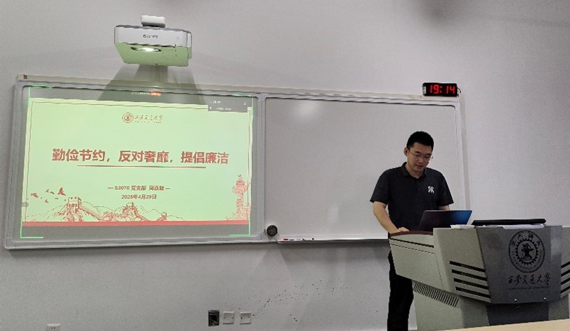 随后,支部成员樊囿麟和周泓毅分别围绕会议主题进行了精彩的分享报告。樊囿麟从党规党纪入手,分享了毛泽东主席和周恩来总理勤俭节约的经典案例。他指出,不论是在革命时期,还是在新中国成立以后的建设时期,毛泽东主席始终以身作则,倡导勤俭节约的生活作风;周恩来总理更是将勤俭放在首位,以实际行动为全党树立了榜样。樊囿麟结合勤俭节约是中华优秀传统美德这一观点,深入阐述了厉行勤俭节约的重要性,呼吁支部成员在日常生活中传承和弘扬这一美德。