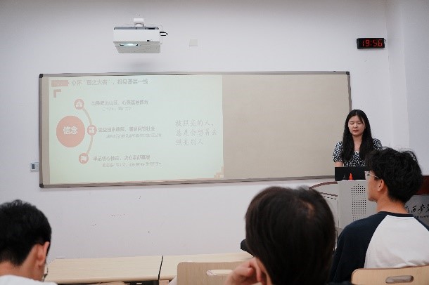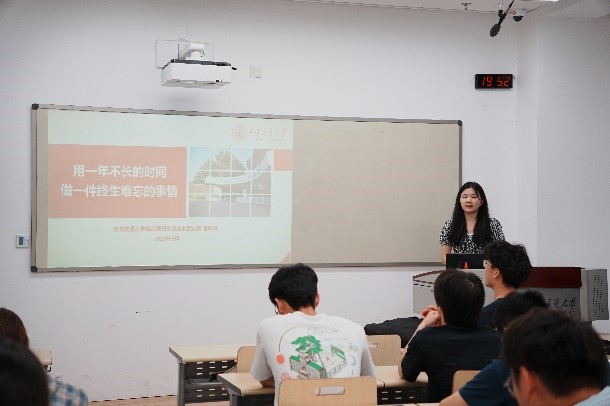 研究生支教团二十余年来扎根西部、服务基层的光荣传统和丰硕成果,回顾了“水暖同欣公益项目”为数千名孩子送去温暖、“传递书香,圆梦大学”项目为山区学校捐建图书室等感人瞬间。随后,她结合自己在施甸一中的支教工作,从初到陌生环境的适应与挑战,到深入了解学生需求、创新教学方法,再到组织丰富多彩的校园文化活动以及利用假期走访调研、参与“智慧农田”研学等社会实践,全方位、多角度地展现了支教生活的点点滴滴。她谈到,支教不仅是知识的传递,更是心灵的碰撞和价值的引领,在帮助孩子们打开视野、点燃梦想的同时,自身也获得了前所未有的成长与历练。官昕姝同学朴实真挚的讲述,让在场青年深切感受到了“奉献、友爱、互助、进步”的志愿精神的强大魅力,以及新时代青年在基层一线淬炼初心、增长才干的宝贵价值。许多同学表示,听完分享后对志愿服务和基层工作有了更深的向往和思考。
