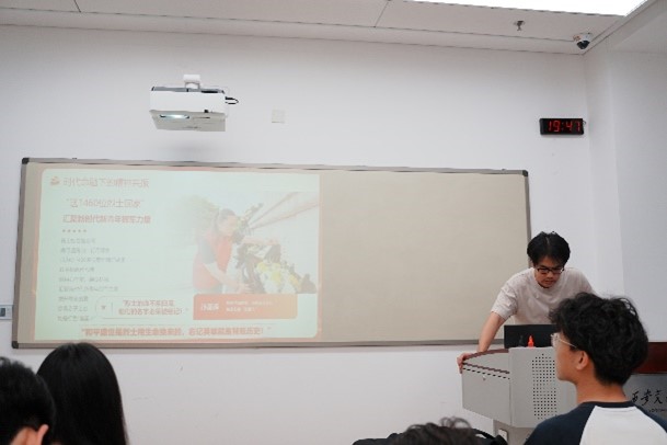 为使理论学习更具感染力和实践指导性,王涵同学选取了来自不同领域的杰出榜样,通过视频、图文和讲述相结合的方式和同学们进行了分享,生动再现了他们的感人事迹和卓越贡献:王兴兴从“车库”起步,凭借对机器人研究的极致热情与执着,带领宇树科技的机器狗“莱卡”亮相央视春晚《秧BOT》节目,惊艳全国,并成功打破国外技术垄断,其“偏科不可怕,只要把擅长的事做到极致”的理念引发青年共鸣;“红色追星人”孙嘉怿“送1460位烈士回家”的感人事迹。她寻遍青山,只为让英烈魂归故里,用行动诠释了“烈士的血不能白流,他们的名字必须被铭记!”的坚定信念,展现了新时代青年对英雄的崇敬和对红色根脉的守护;中国一汽的王斯博以其在新能源汽车领域的“极致创新”事迹激励着大家。他带领团队攻克技术难关,推动“红旗”品牌自主电驱技术从跟跑到领跑,用“我们科研人员始终保持的冲刺姿态”诠释了青年科技工作者的担当与追求;无臂游泳健将郭金城用双脚改写命运的故事深深打动了在场青年。他以惊人毅力克服身体障碍,在巴黎残奥会男子50米自由泳S5级决赛中勇夺金牌,用“水不会因为我没有手臂就减少阻力,但我会用每一次打腿证明,命运可以被改写”的豪言,展现了自强不息的拼搏精神。
