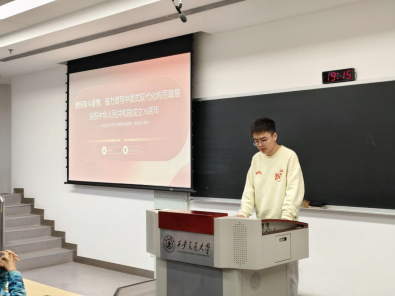 第三阶段,硕5066党支部入党积极分子龚夏围绕《筑牢中华民族共同体意识》作专题汇报。在新疆维吾尔自治区成立70周年的时代背景下,龚同学深入阐述了习近平总书记关于“筑牢中华民族共同体意识是新时代党的民族工作的主线”的重要指示精神,强调了新疆维吾尔自治区的“五大战略定位”,为新时代民族工作提供了指导思想和战略方向。通过强化民族团结和共同体意识,进一步推动了民族地区的稳定与发展。龚同学的讲解令全体党员更加深刻认识到,团结各族人民,维护社会和谐,是实现中华民族伟大复兴的关键所在。