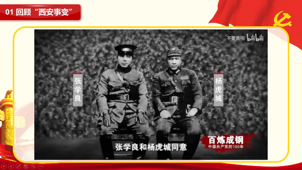本次党史学习选取了《百炼成钢——中国共产党的100年》系列影视作品中关于西安事变的节选。西安事变是中国历史上的一个重大转折点,在1936年12月12日张学良和杨虎城为了逼迫蒋介石抗日,发动了兵谏,扣留了蒋介石。这一事件最终在中国共产党的积极斡旋下和平解决,促成了国共两党的第二次合作,开启了双方一致抗日的新阶段,为抗日民族统一战线的建立奠定了基础。