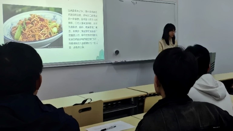 在介绍了家乡美景后,同学们也纷纷向大家分享自己家乡的美食,让大家感受到了家乡美食的独特风味。首先刘清秋同学介绍了自己家乡山西的经典面食,据介绍山西面食历史悠久,源远流长,花样多又美味可口,让大家垂涎欲滴。王楠钰同学介绍了自己家乡的美食南昌米粉,在她绘声绘色的介绍下,同学们仿佛身临其境地尝到了南昌米粉这一著名小吃。通过这次团支部范围内的分享活动,同学们纷纷表示收获良多,不仅加深了大家对家乡文化的了解,拓宽了对家乡美丽风光与美食的认识,更是在互动中加深了对彼此的了解和班级的凝聚力。在之后的活动总结环节中,大家踊跃分享心得,不少同学表示会更加珍惜家乡的传统文化,并将这份情感带给身边更多人。