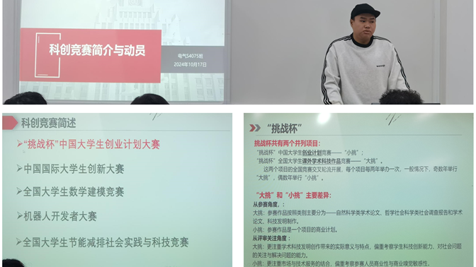 毛文宇同学为大家简单介绍了各类科创竞赛。科创竞赛主要包括以下几个项目:“挑战杯”中国大学生创业计划大赛、“挑战杯”全国大学生课外学术科技作品竞赛、中国国际大学生创新大赛、全国大学生数学建模竞赛、机器人开发者大赛、全国大学生节能减排社会实践与科技竞赛。这些竞赛旨在激励大学生的创新意识和实践能力,促进科技与社会问题的结合。通过参与竞赛,同学们可以提升自己的创新思维、实践技能和科研素养,增强解决实际问题的能力。