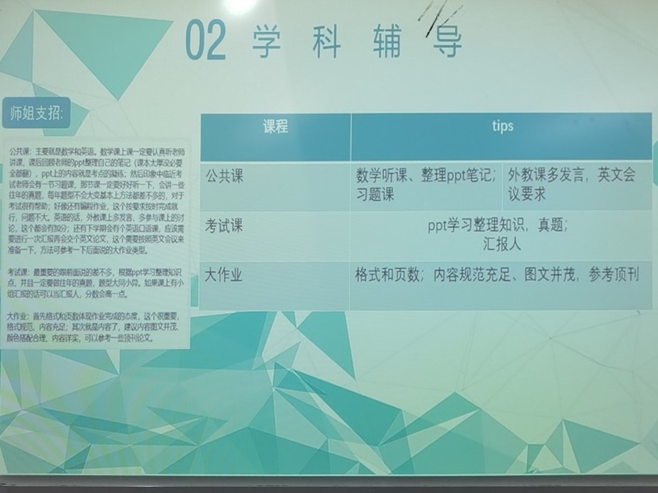 蔡祥同学介绍了关于不同学科的学习经验,通过观看对往届师兄师姐的采访视频,同学们了解到对于公共课程的学习方法。具体而言,数学要认真听课,课堂外应及时回顾PPT并整理笔记,重视习题课和往年真题,按时完成编程作业;英语课应多发言,积极参与讨论,英语口语课程需准备汇报和英文论文。针对需要考试的科目可根据PPT整理知识点,练习往年真题,课堂上可主动担任汇报人以提高成绩;对于大作业应该保证格式规范、内容充足,做到图文并茂、颜色搭配合理,还可参考相关期刊论文。