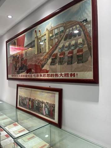 宣传画陈列厅中有一副巨大的南京长江大桥建成宣传画,虽然这幅画受限于当年的印刷技术,是由两张纸拼接而成,但是画面上栩栩如生的场景依然生动地展示了大桥建成时候的万人空巷的盛况,讲解员充满自豪地向我们介绍到,该桥1960年以“世界最长的公铁两用桥”被载入《吉尼斯世界纪录大全》,由于南京长江大桥的建成,南京人民在那段时间流行给小孩取名“长江”、“大桥”、“桥墩”之类的名字。