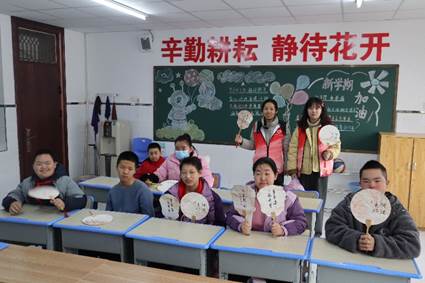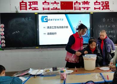 为了激发孩子们的艺术创造力,实践团队组织了一场别开生面的漆扇手工制作课程。活动中,团队成员向同学们介绍了中国漆艺的历史渊源及其独特的魅力,并向同学们播放了漆扇制作视频。随后,在团队成员的耐心指导下,学生们选择了自己喜欢的颜色,小心翼翼地将颜料滴入水中,用竹签轻轻划出美丽的图案,再慢慢旋转下入扇子,完成了属于自己的独一无二的作品。整个过程充满了欢声笑语,孩子们的脸上洋溢着自豪的笑容。
