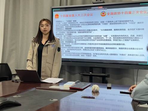 为了引导团员全面及时了解国家大政方针和发展战略,生活会进行了两会精神交流学习。在生活会中,同学们聚焦两会关键词,分享了自己的观点与思考,凝聚了前行奋斗的力量。汪艳霞同学针对“人工智能”关键词,结合最近热门的AI大模型,给出了自己对于科技创新的理解以及未来科技发展方向的看法。董嘉陶同学针对“提振消费”关键词,以同学们日常生活中的消费情况为例,分享了未来国内经济高效循环的展望。