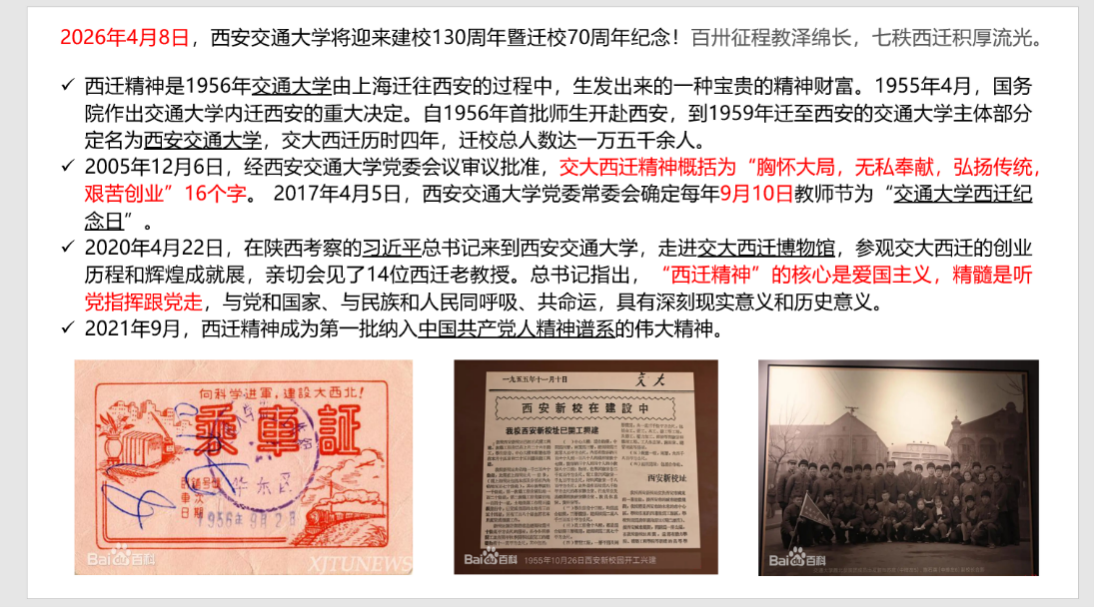 建校129周年暨迁校69周年,团支部组织全体成员重温了习近平总书记考察西安交大时的重要讲话精神,深刻学习领悟西迁精神的丰富内涵。通过观看校史纪录片、分享西迁故事、组织志愿服务等活动,团员们纷纷表示要继承前辈精神,争做新时代的“西迁新传人”。