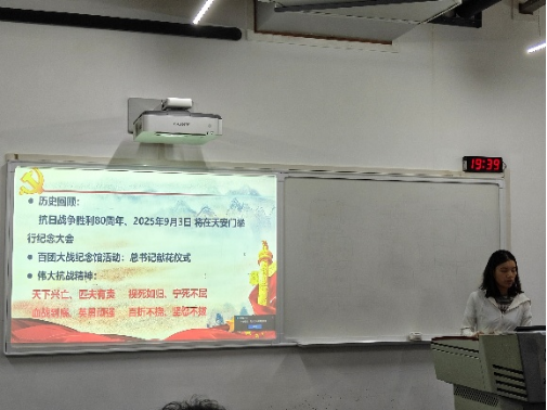 2025年是中国人民抗日战争暨世界反法西斯战争胜利80周年,具有重大历史意义。习近平总书记于7月7日在山西阳泉市向抗战烈士敬献花篮并参观百团大战纪念馆,强调伟大抗战精神是中华民族的宝贵精神财富。彭诗哲同学带大家重温了这一伟大精神的内涵,包括“天下兴亡、匹夫有责”的爱国情怀、“视死如归、宁死不屈”的民族气节、“血战到底、英勇顽强”的英雄气概和“百折不挠、坚忍不拔”的必胜信念。结合“西迁精神”,支部成员深刻认识到青年党员应承担的国家使命,尽己所能,服务国家、社会和人民。