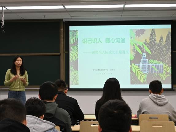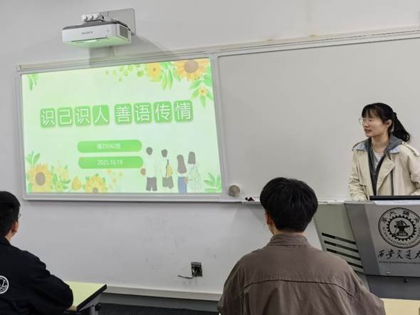 随后,心理委员谭玲以“识己识人,善语传情”为主题开展专题分享。结合自身学习心理知识的经历与班级日常相处观察,她提出:“博士生阶段的人际交往既是生活中的‘情感纽带’,更是科研合作中的‘助推器’,良好沟通的前提在于先‘识己’,再‘识人’,最终以‘善语’传递真情。”